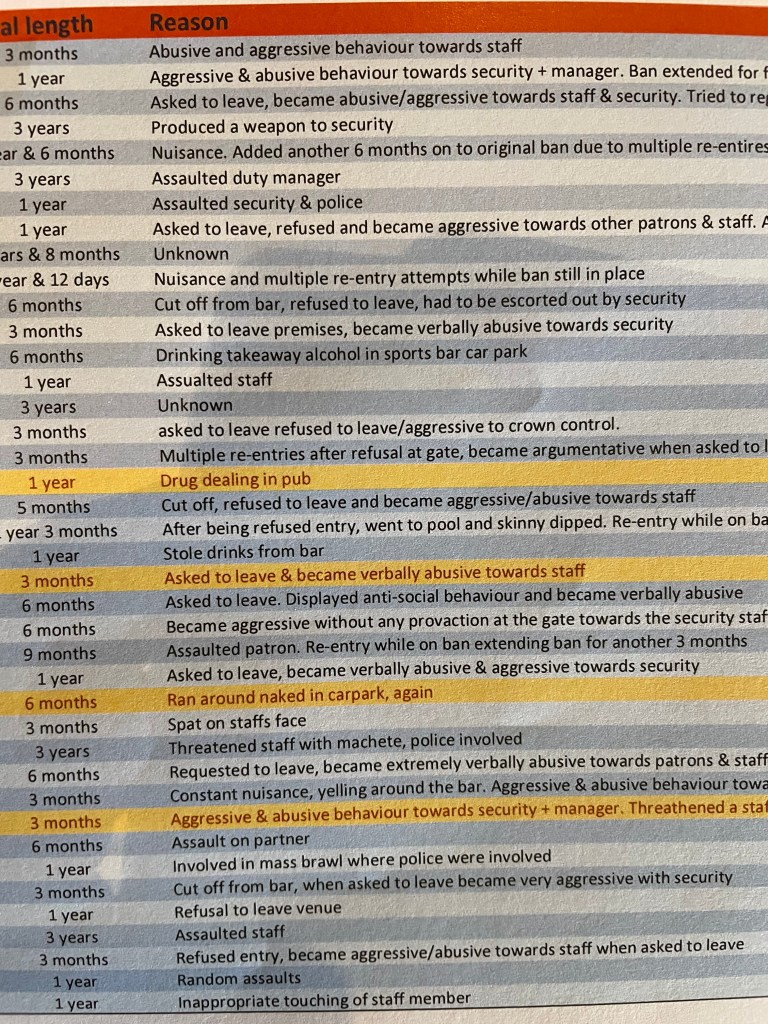 Around 90 people are currently prohibited from entering the hotel premises on past bad behavioral grounds. That’s not far off ten percent of the towns population. Imagine a town in country Victoria banning ten percent of it’s population and trying to survive. No chance. And just feast on some of the listed reasons below as to why some of these people are serving bans. Yet despite this the place is rammed most nights.